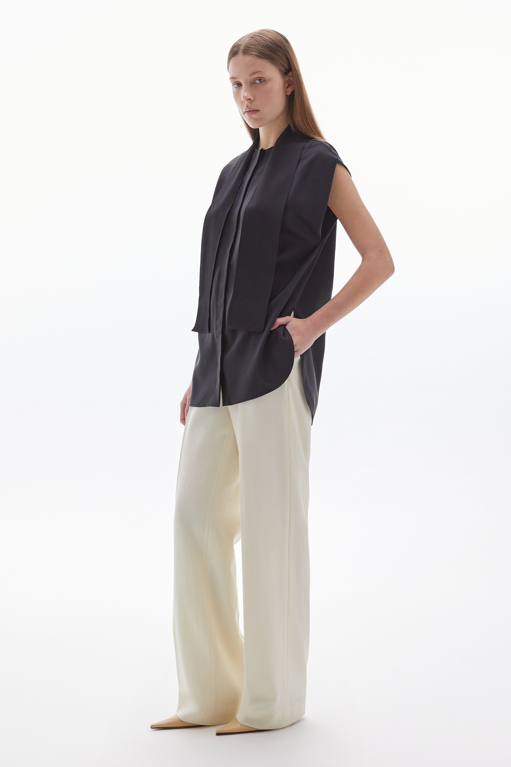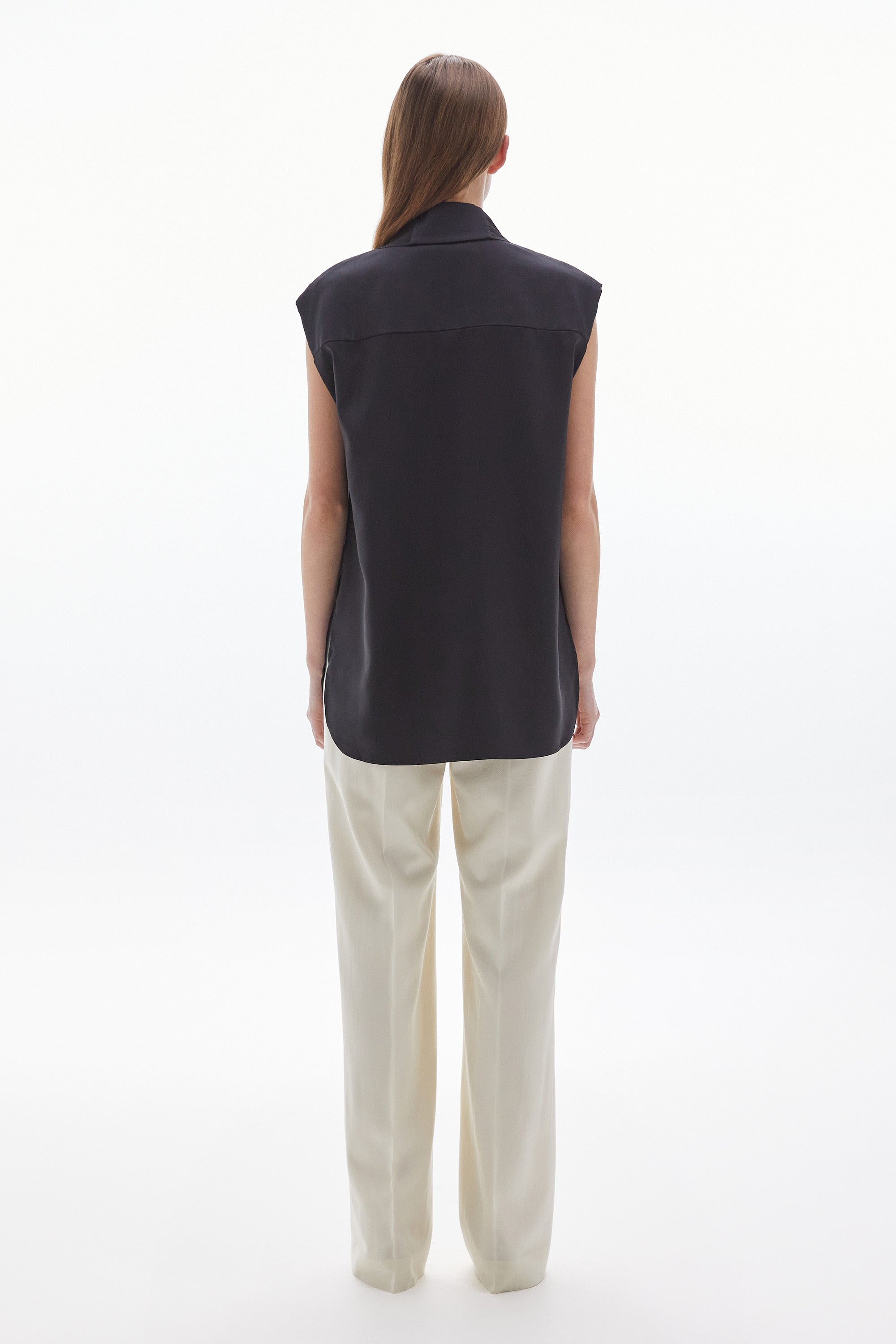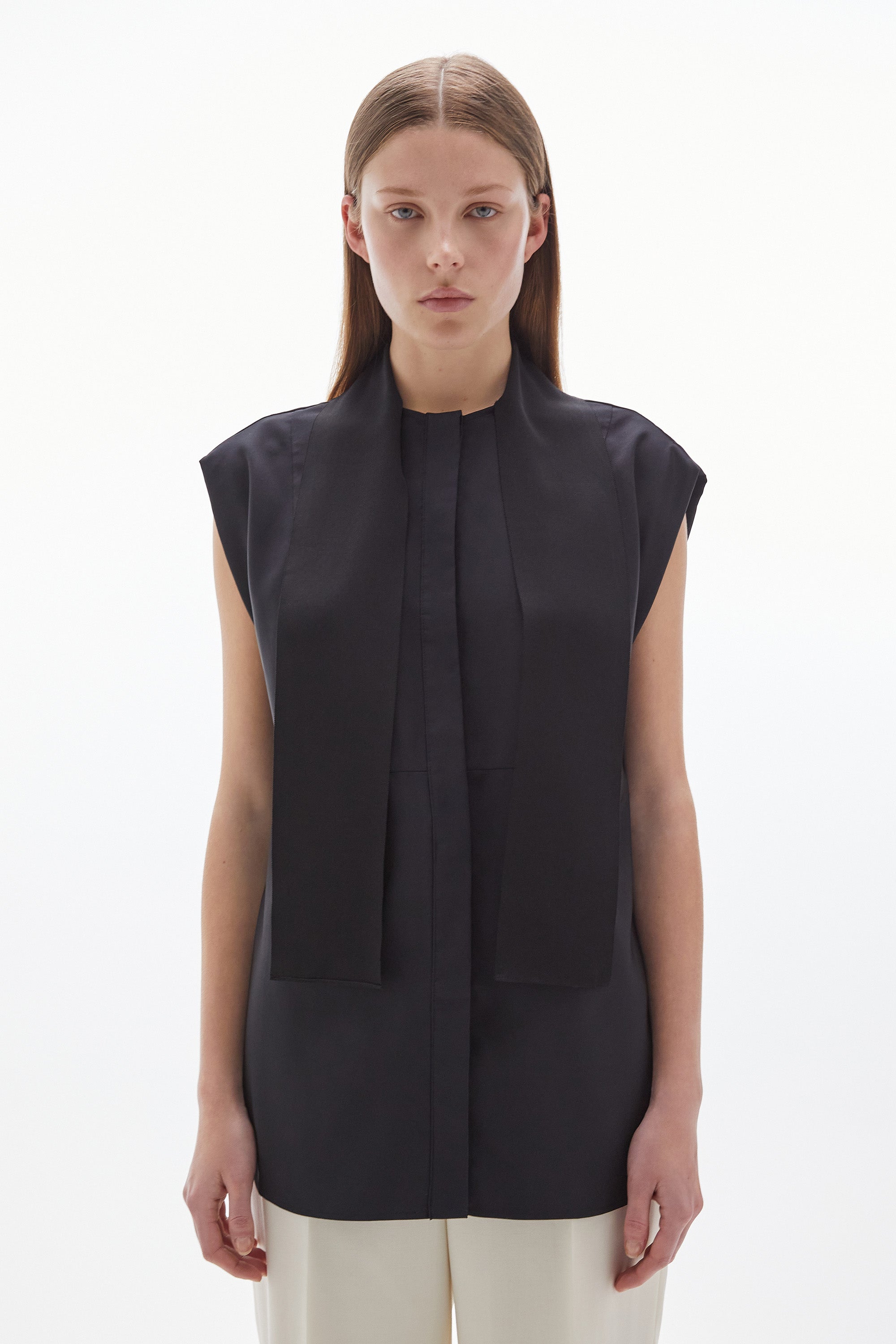 Sleeveless shirt in silk habotai with grosgrain tie neck detail, concealed button front and curved hem with side splits.