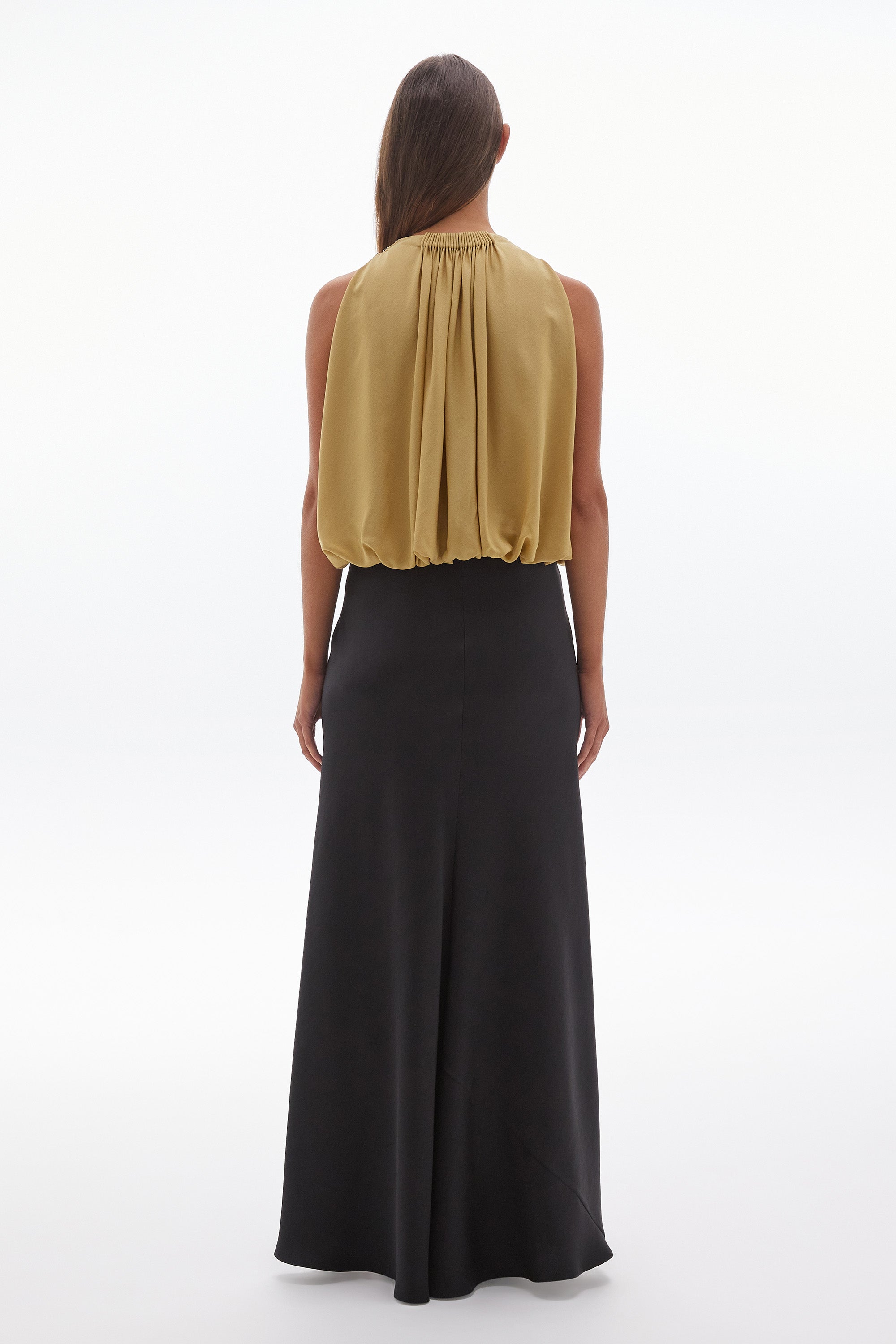 Bias cut maxi skirt in double satin with a concealed elastic waist. This style is fully lined.