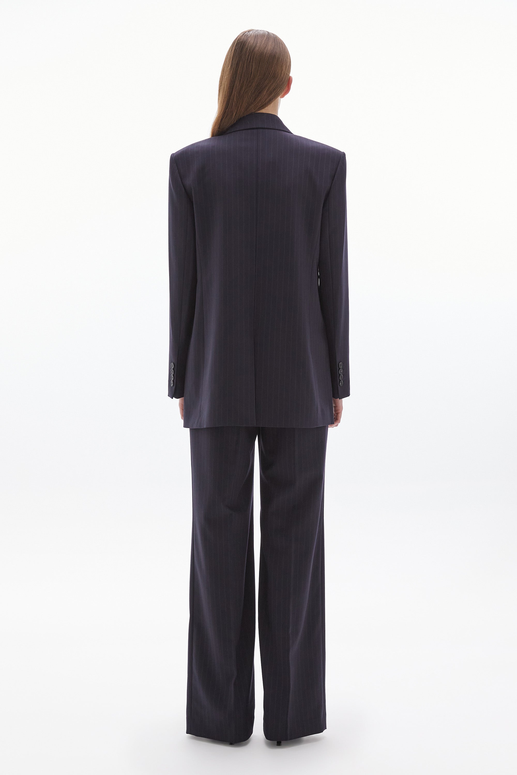 Relaxed double-breasted blazer in wool blend ink pinstripe with peaked lapels and front flap pockets. This blazer is made using traditional tailoring techniques with internal half-canvas construction, felt under-collar and front darts for structure and shaping.