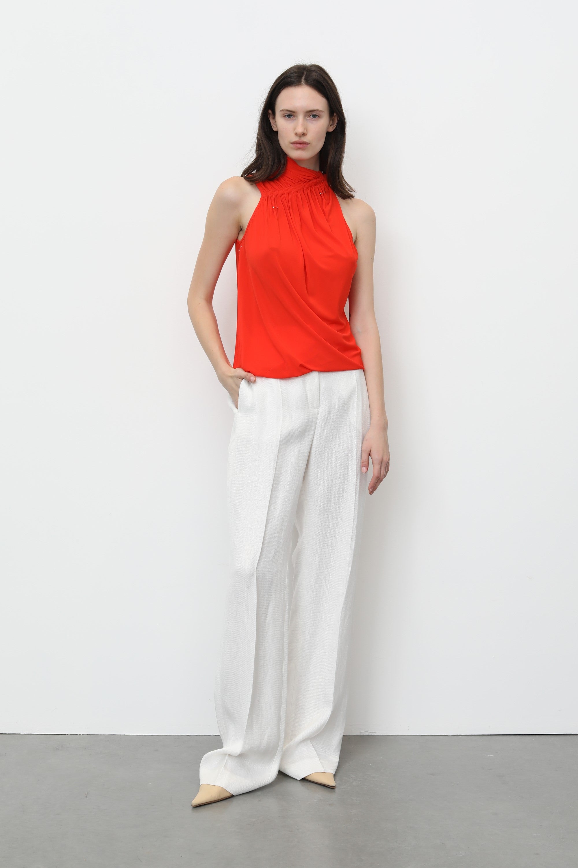 Softly draped sleeveless top in light jersey stretch featuring an elegant asymmetric neckline accented with pleat detailing.