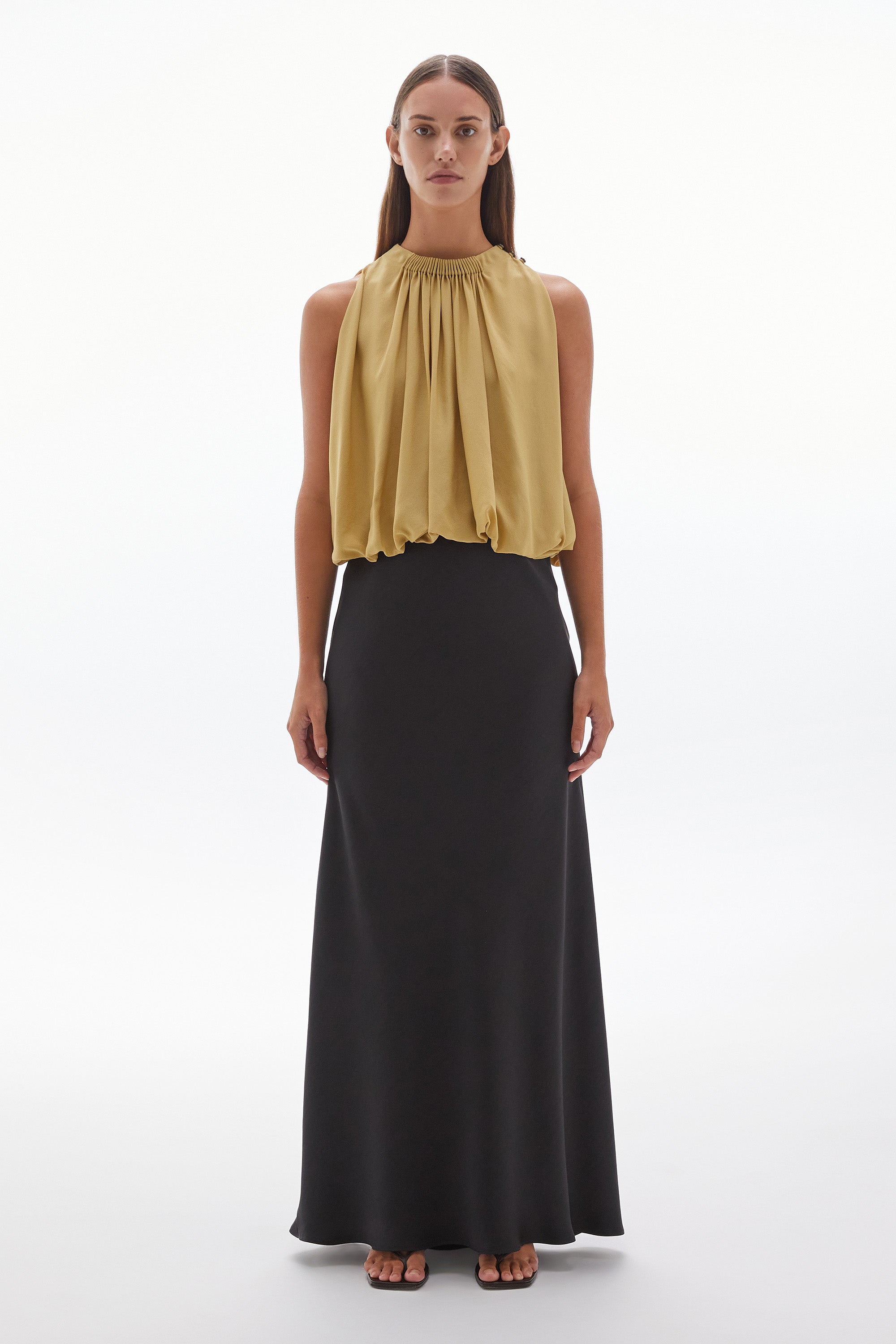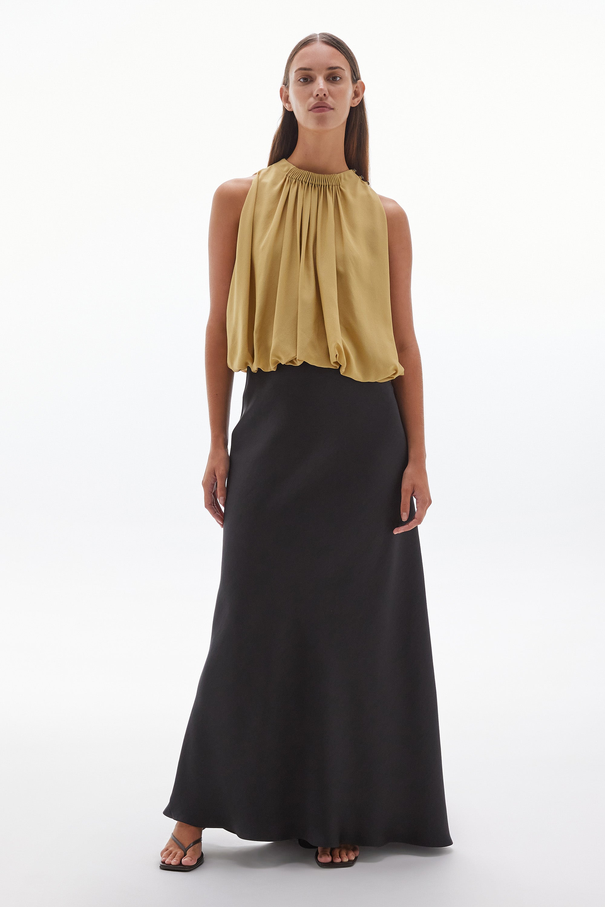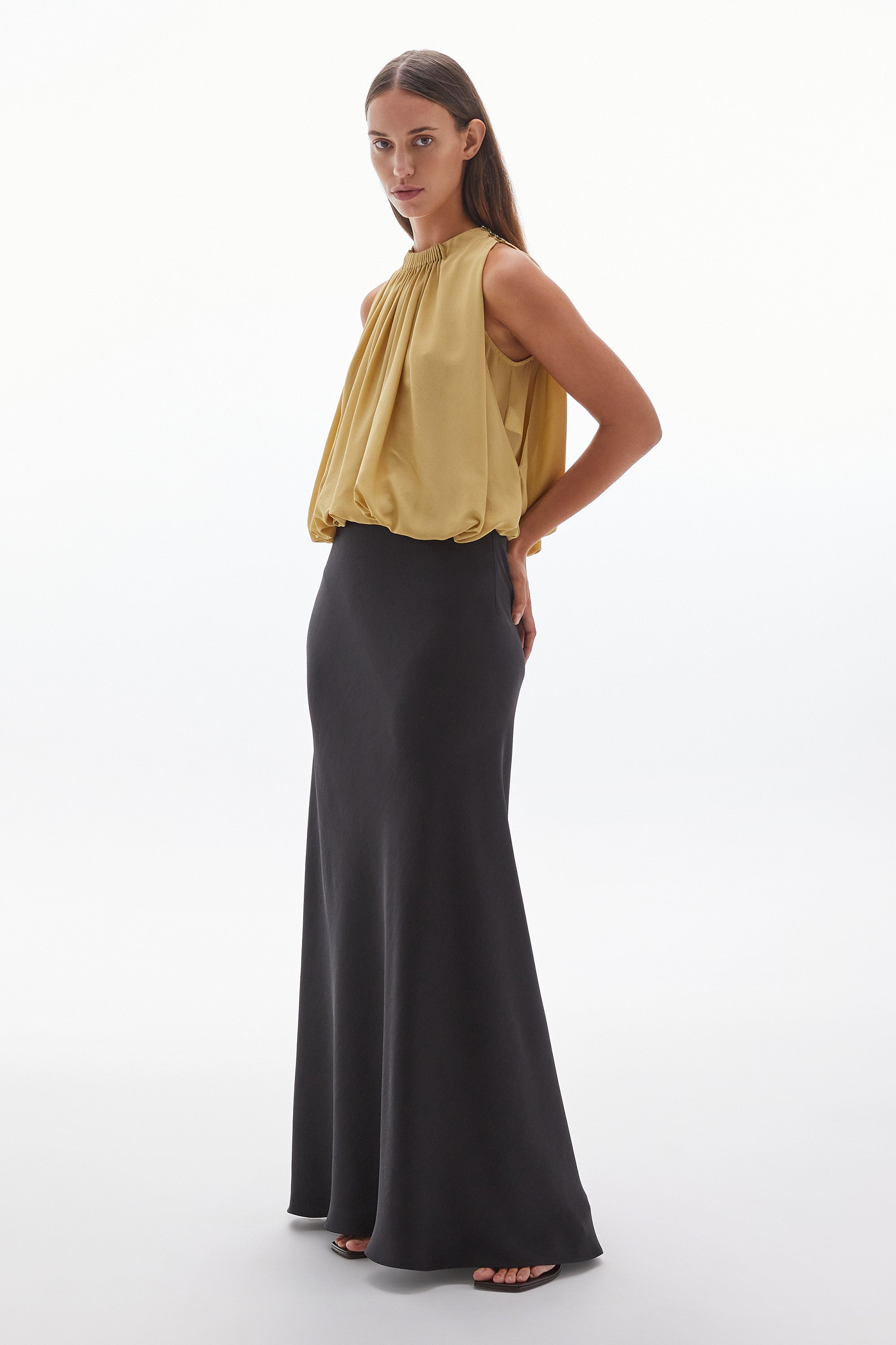Bias cut maxi skirt in double satin with a concealed elastic waist. This style is fully lined.