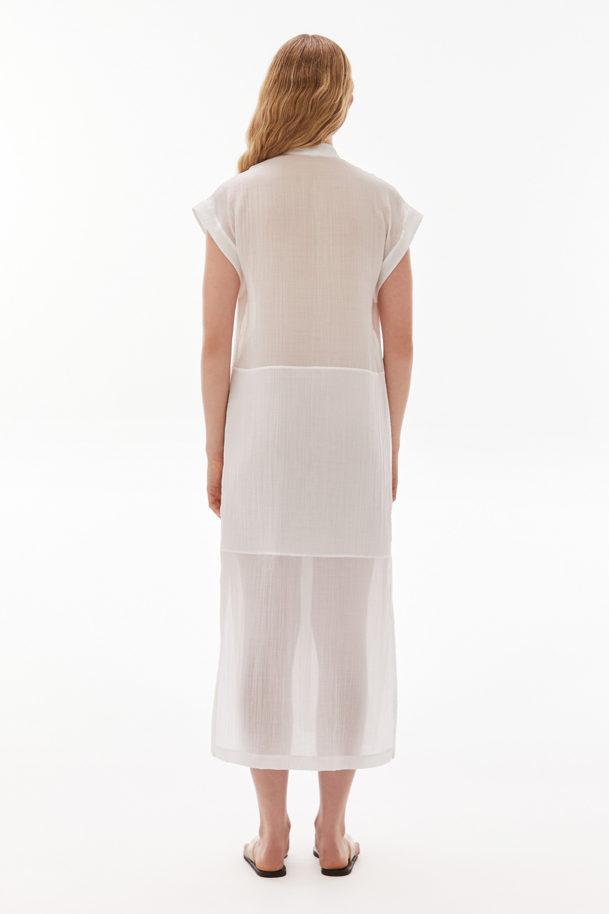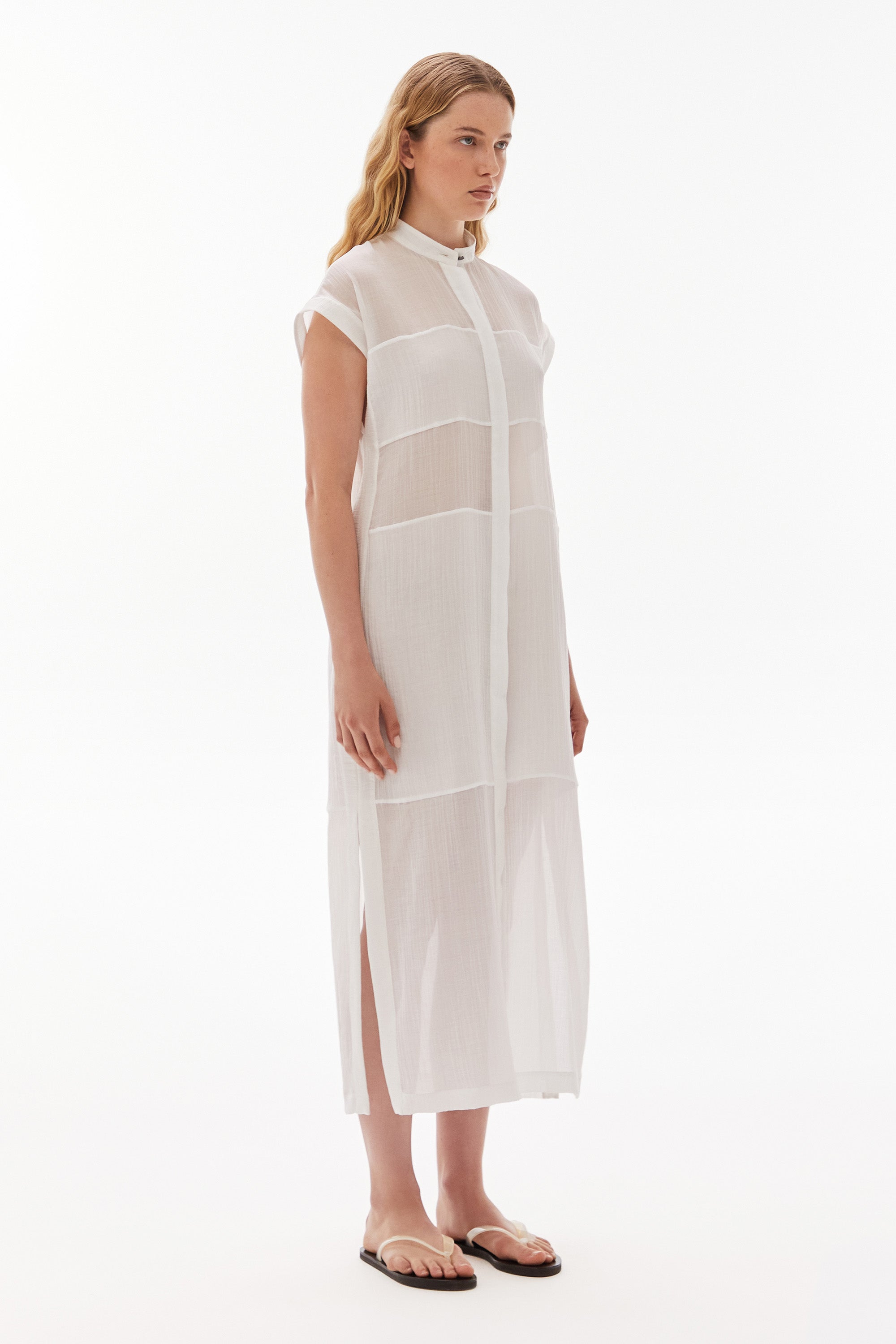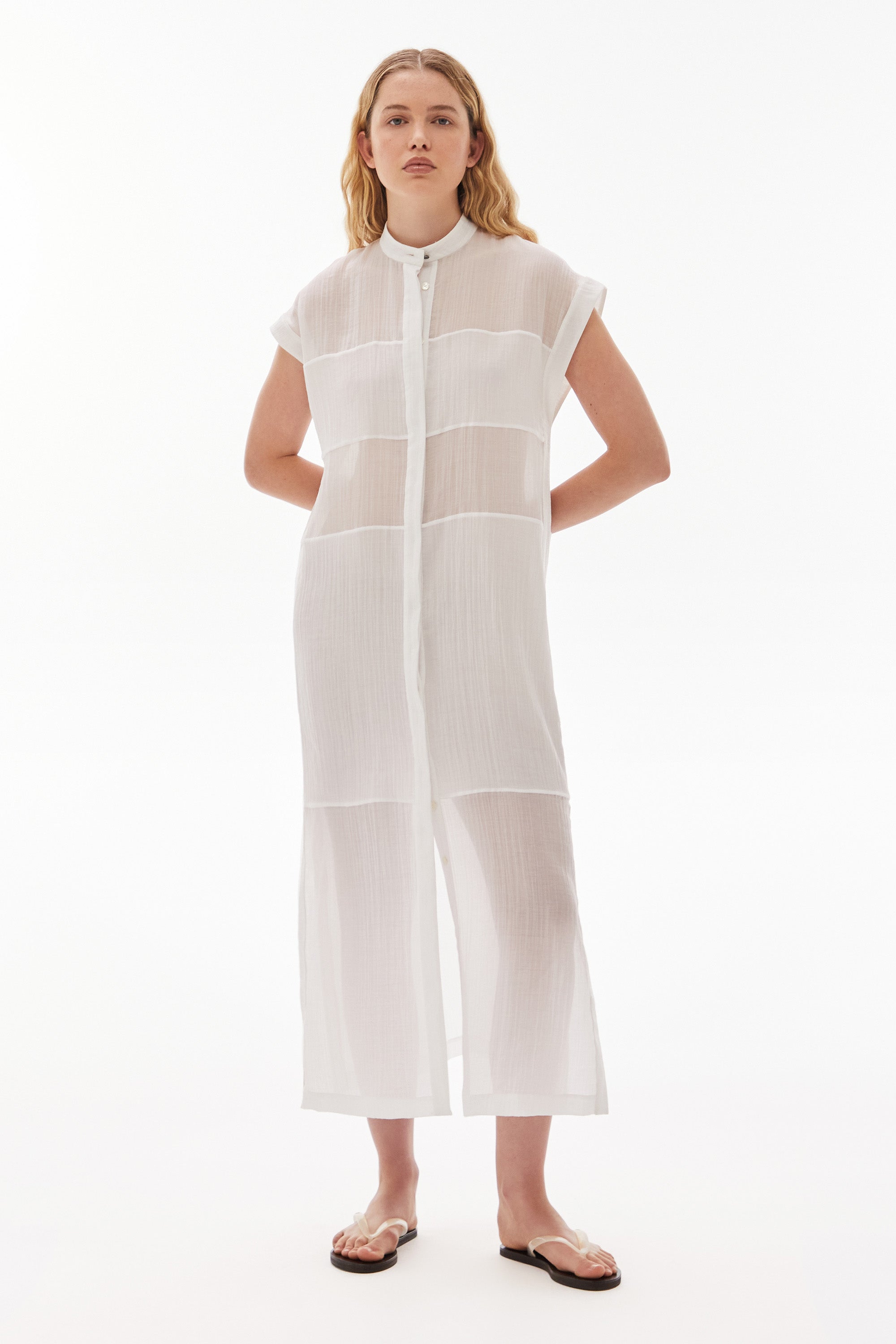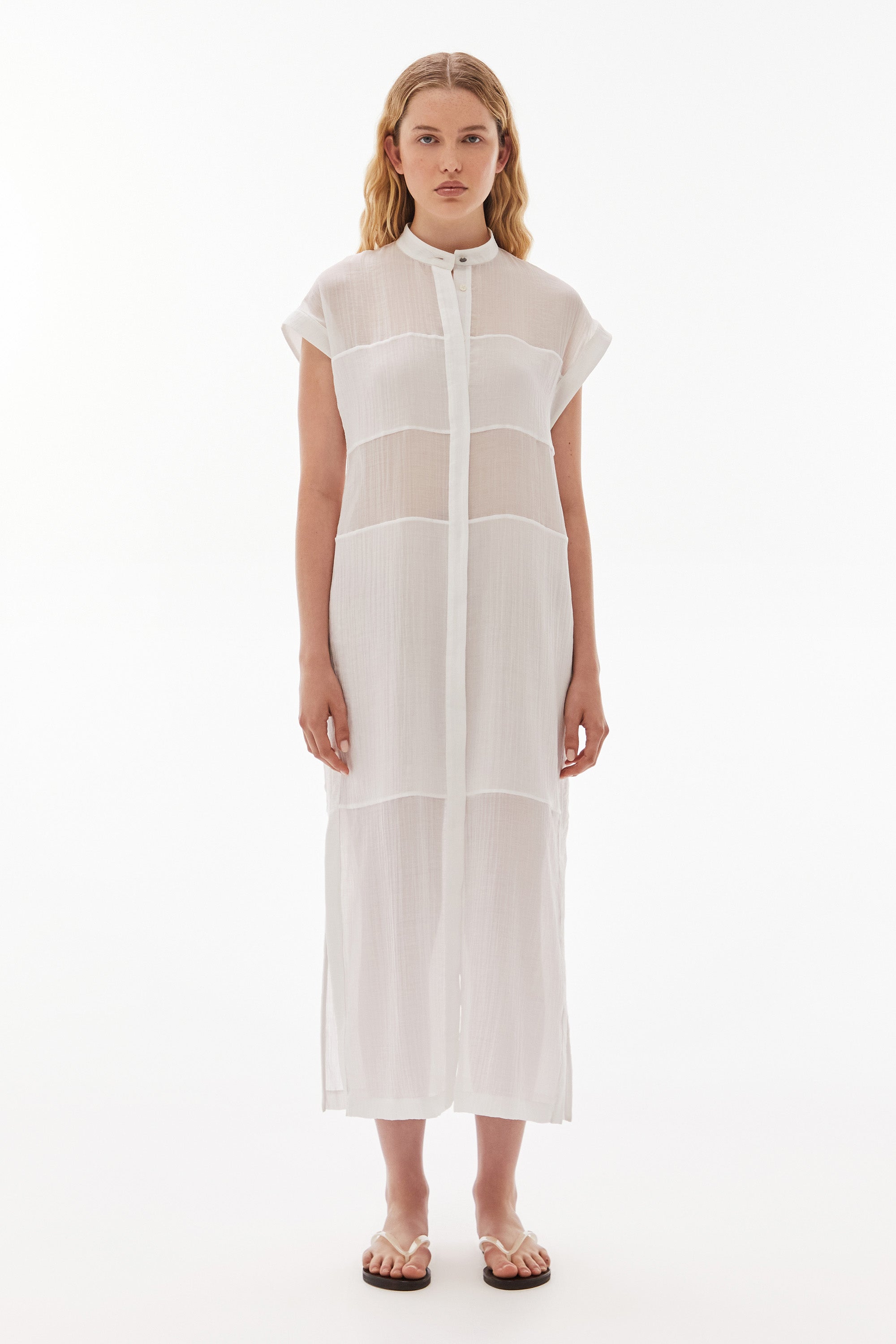 Easy and relaxed button-through dress in light crinkle with a band collar, cap sleeves and panel detail.
