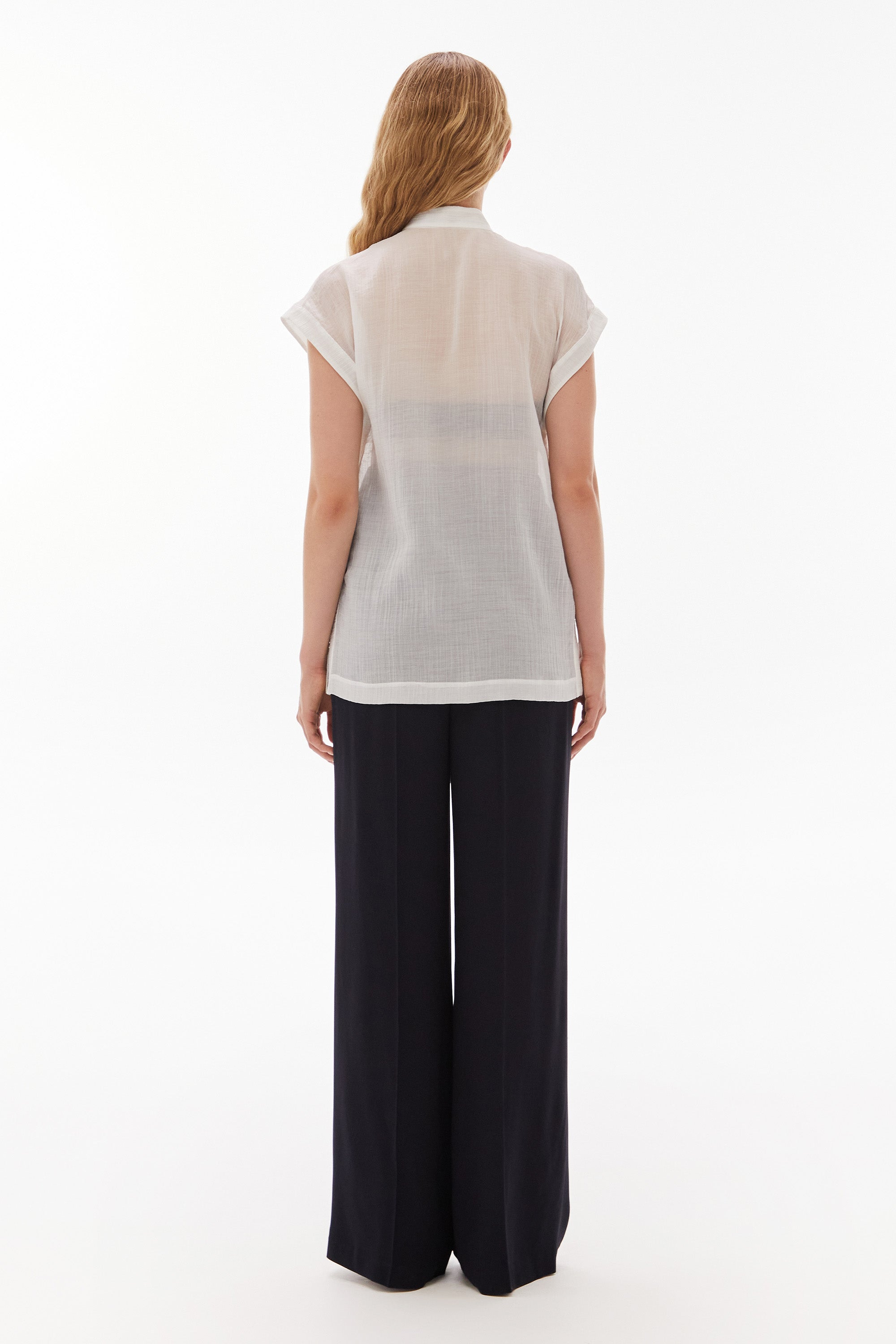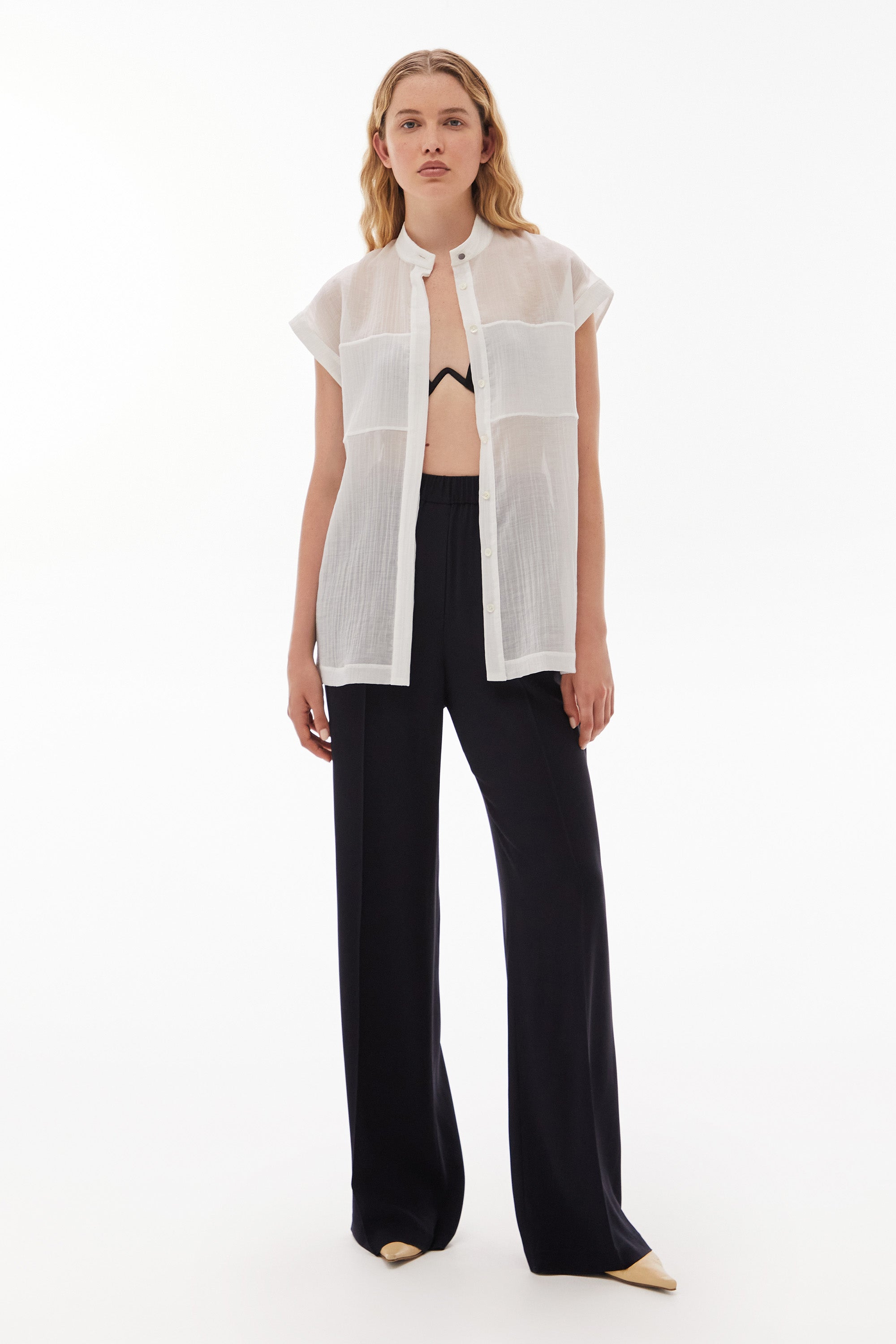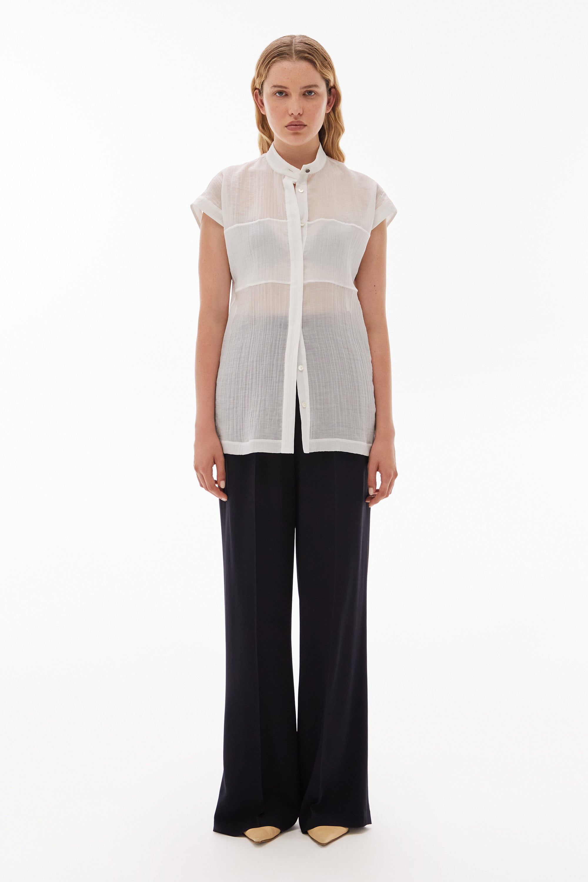 Easy and relaxed top in light crinkle with a band collar, cap sleeves and bust panel detail.