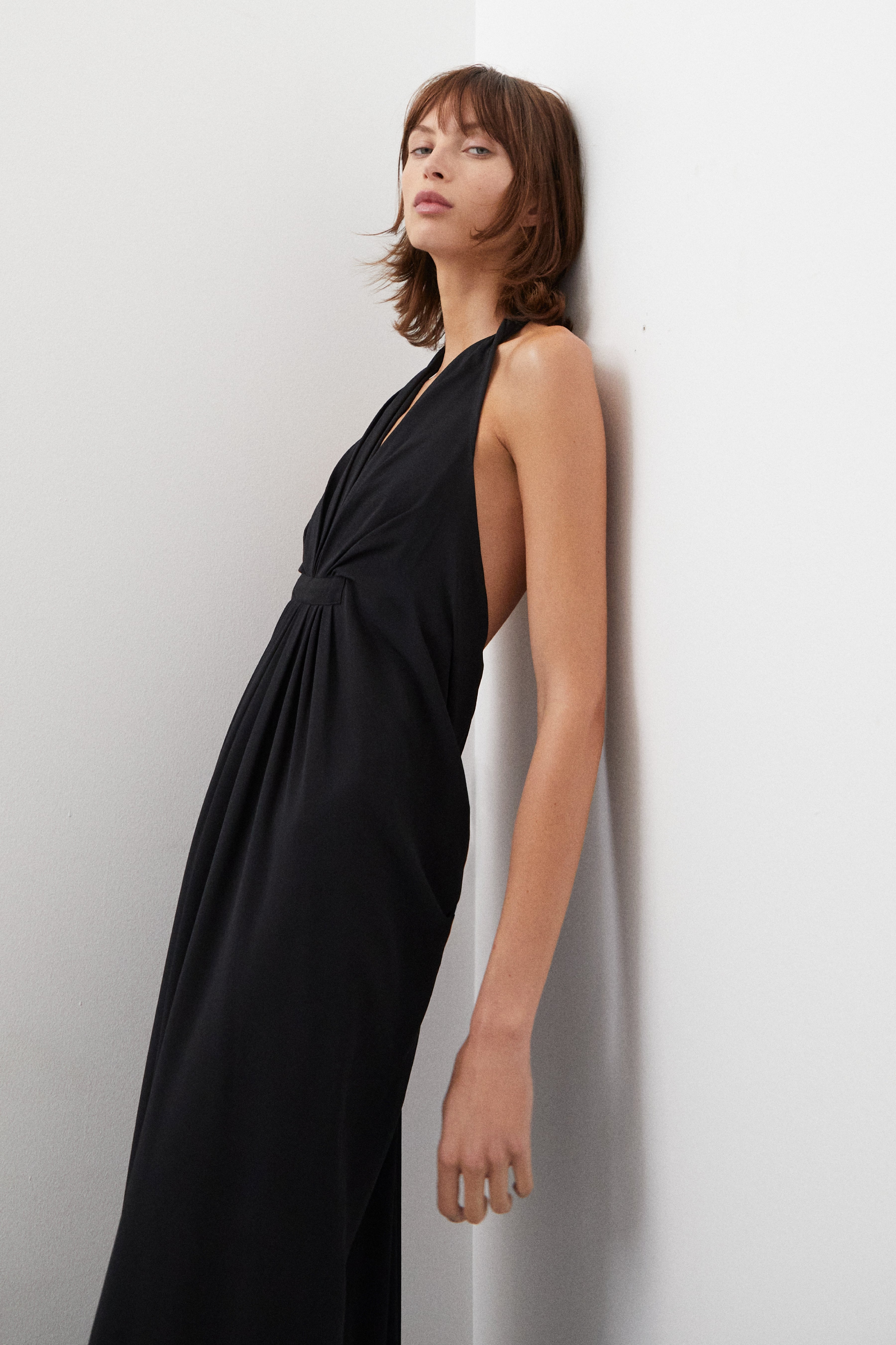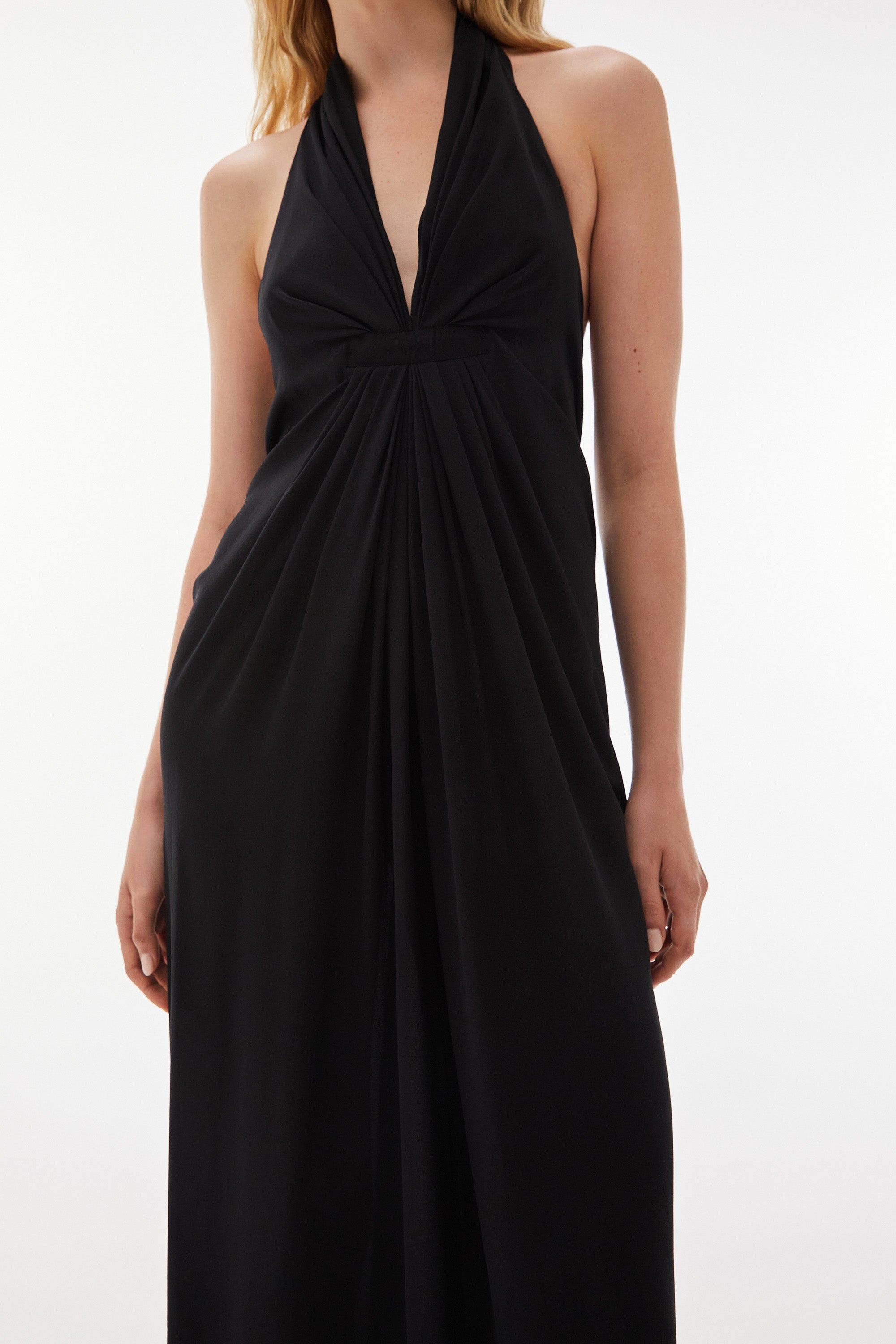 Halter dress in silk crepe with a deep V-neckline and grosgrain-accented tuck detail at the bust, finishing in a soft drape. The back is low, with an encased elastic strap secured by a branded clasp.