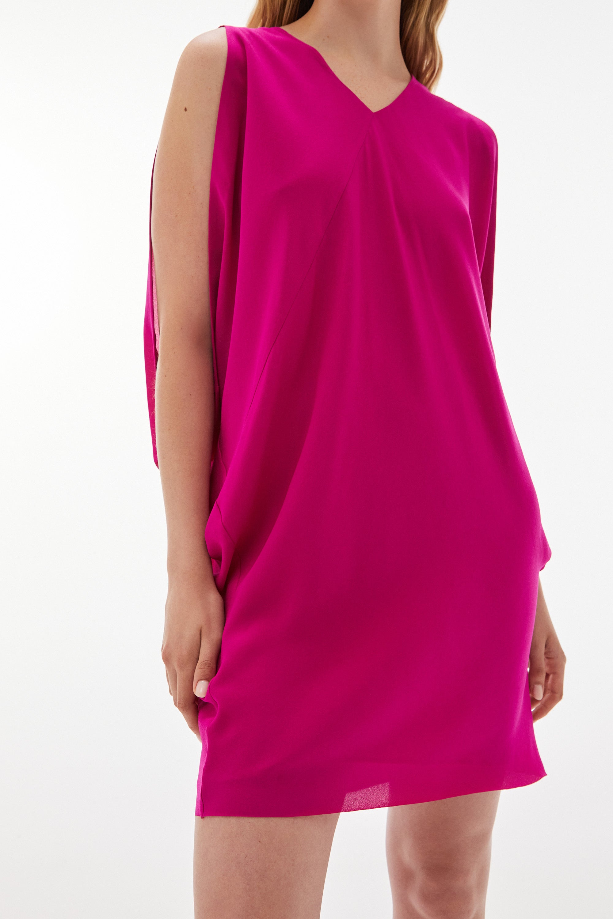 Short bias cut dress in silk crepe with softly draped slit sleeves and a V-neckline.