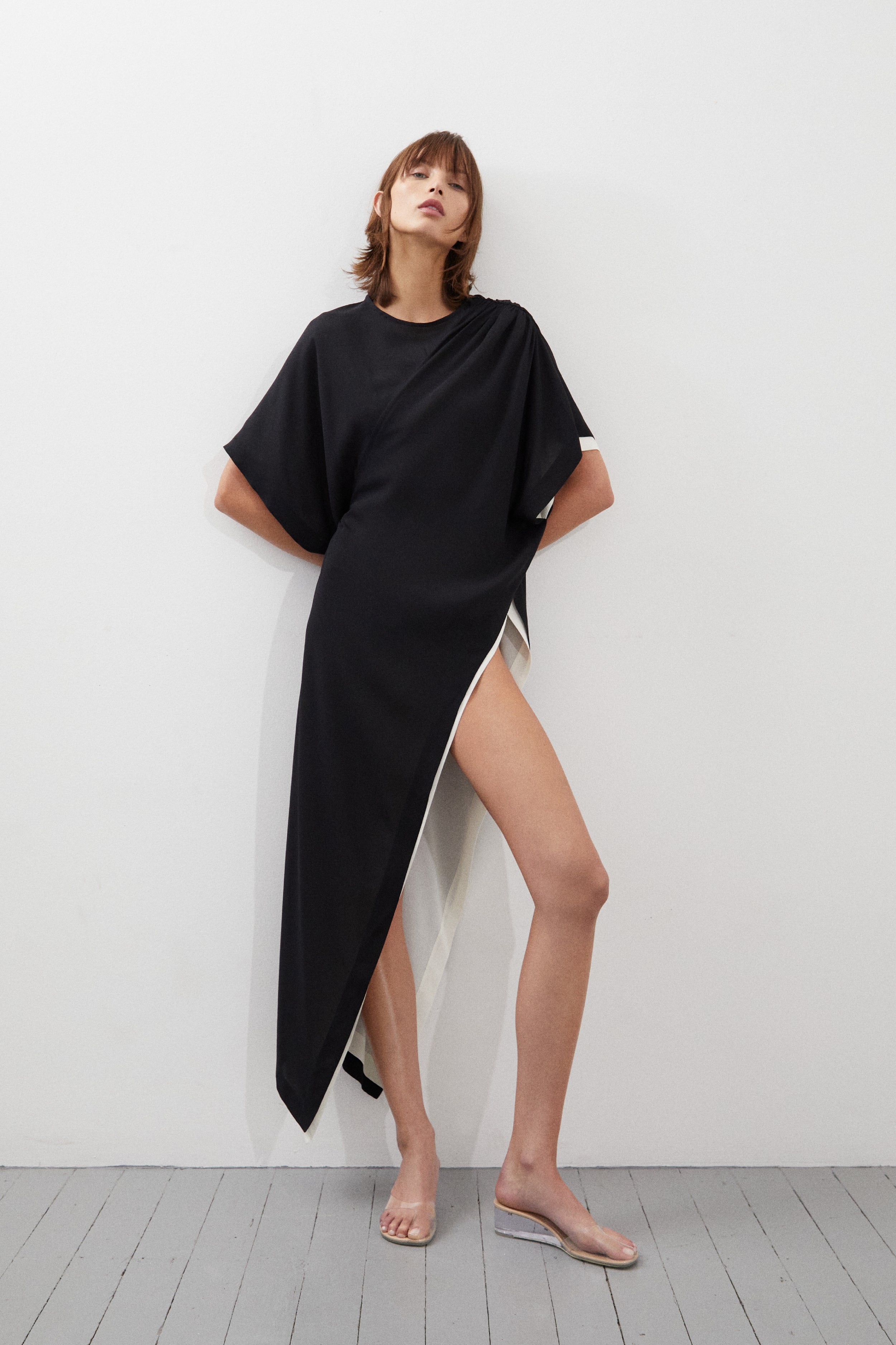 Softly draped tunic in sheer silk crepe with a bateau neckline, bias cut bodice and gather detail at the shoulder and hip. The asymmetric hem is accented with a high side split.