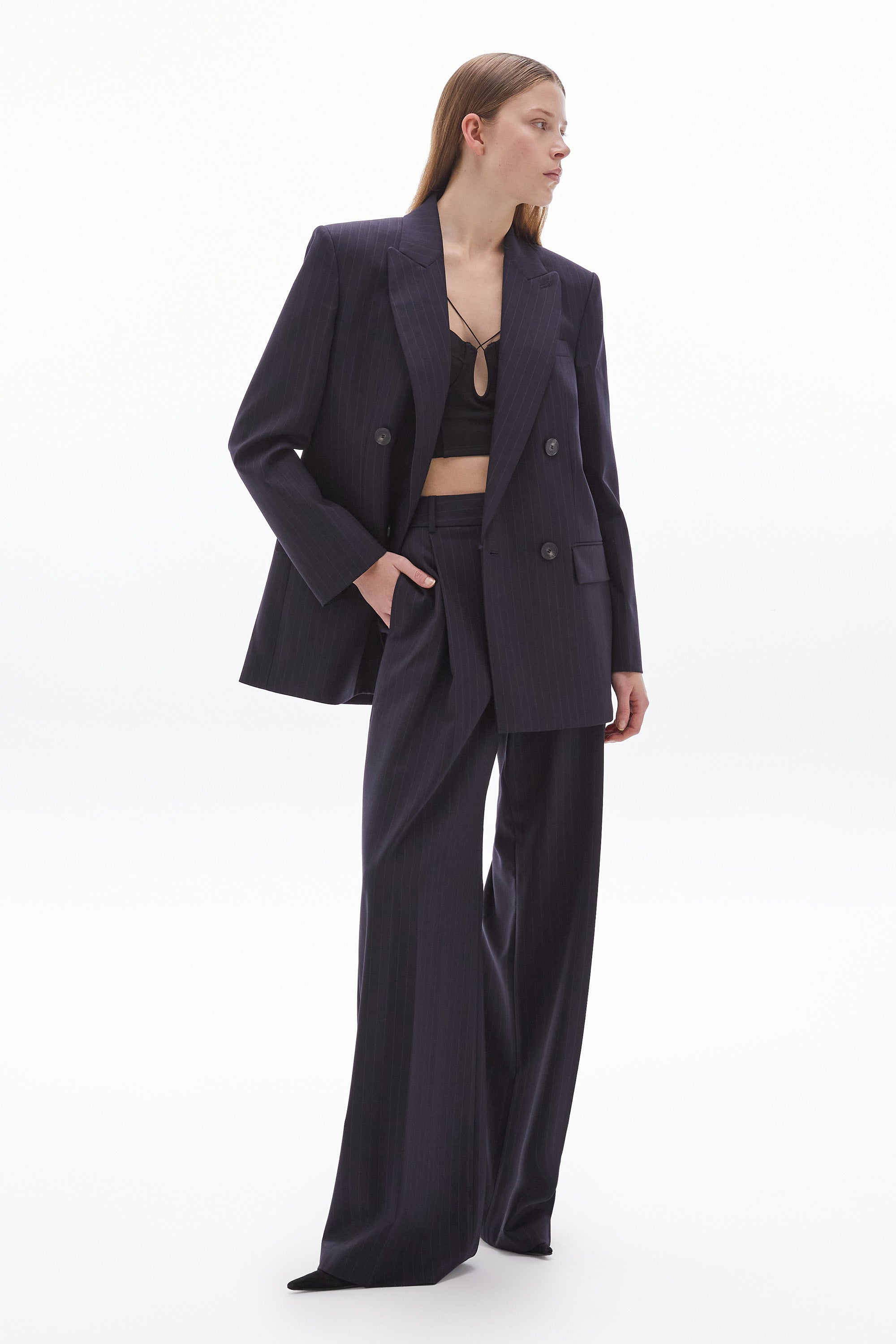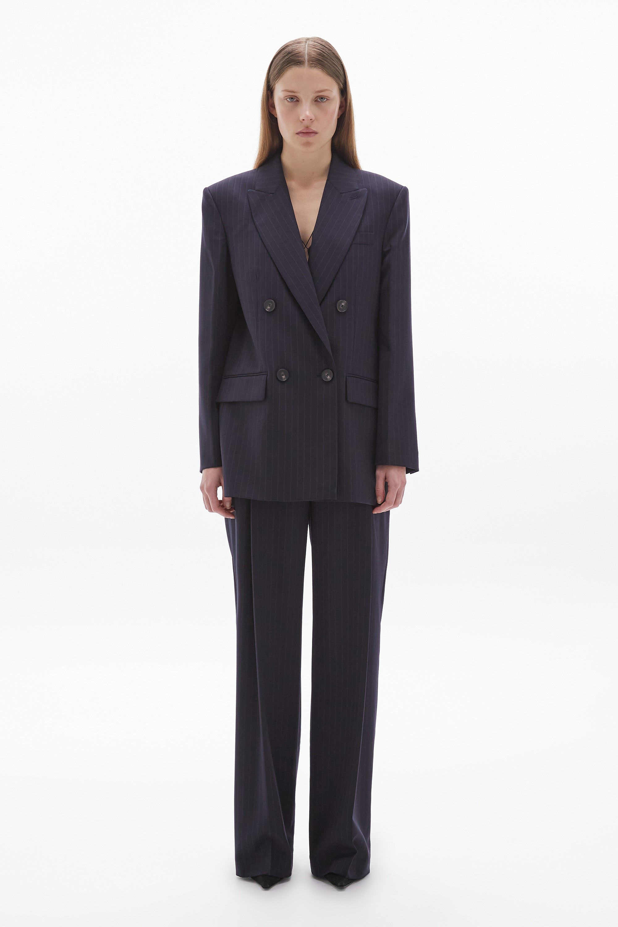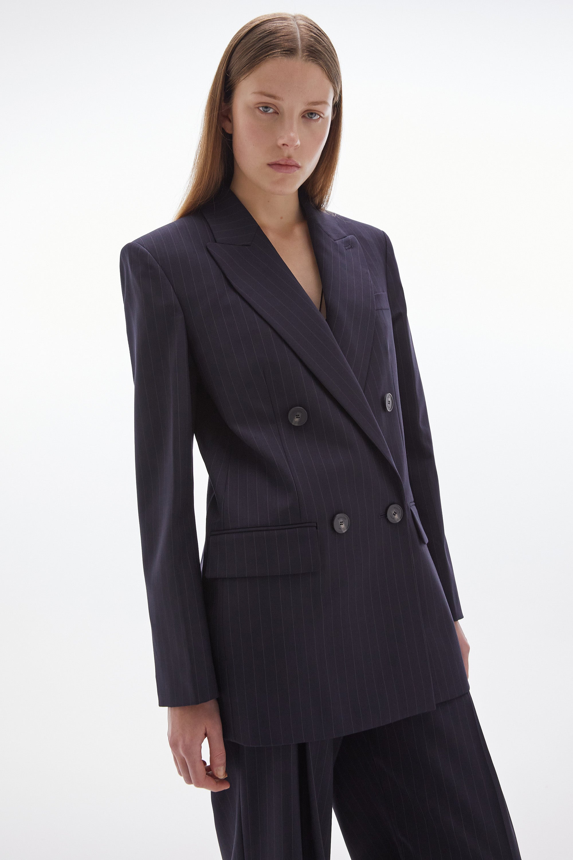 Relaxed double-breasted blazer in wool blend ink pinstripe with peaked lapels and front flap pockets. This blazer is made using traditional tailoring techniques with internal half-canvas construction, felt under-collar and front darts for structure and shaping.