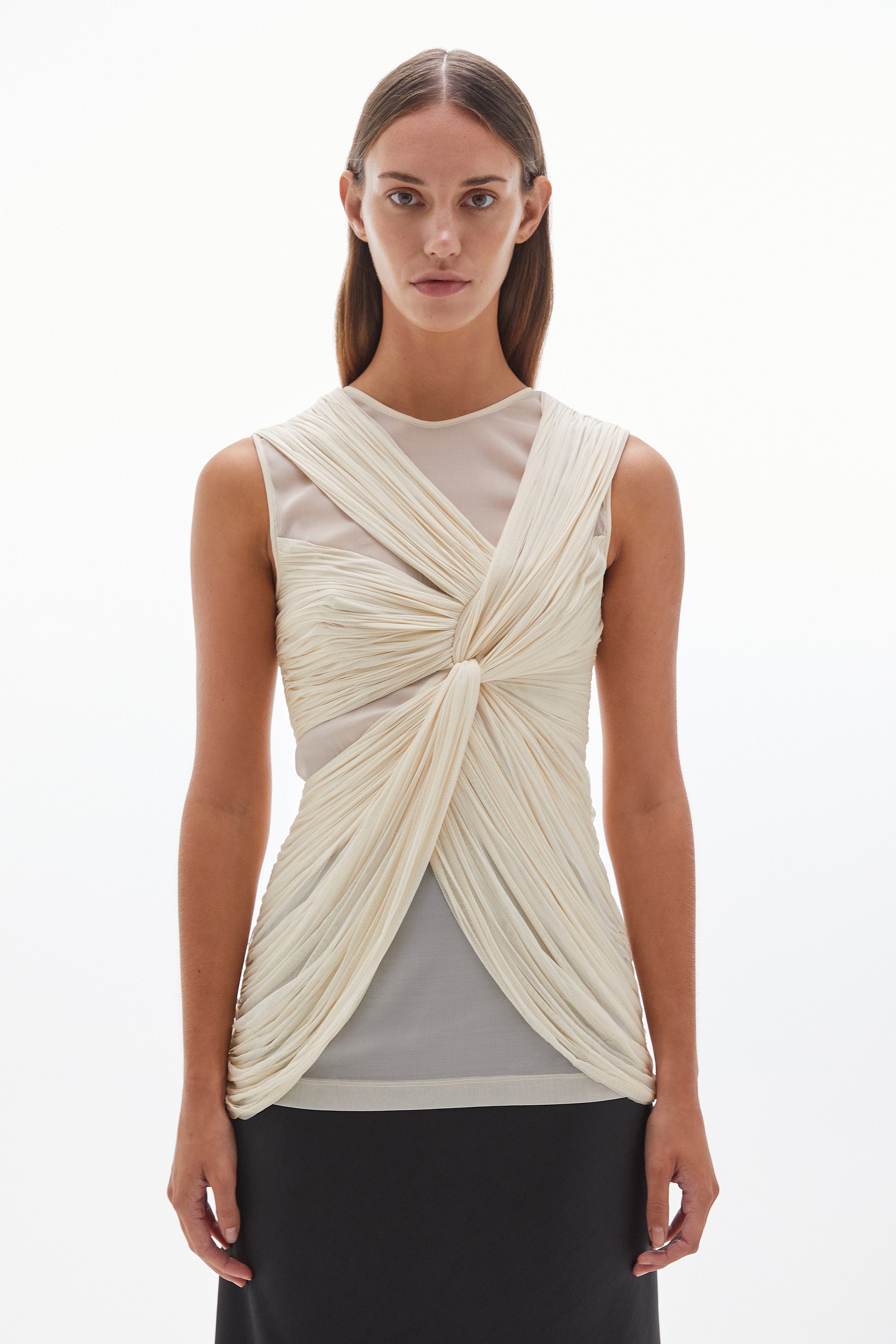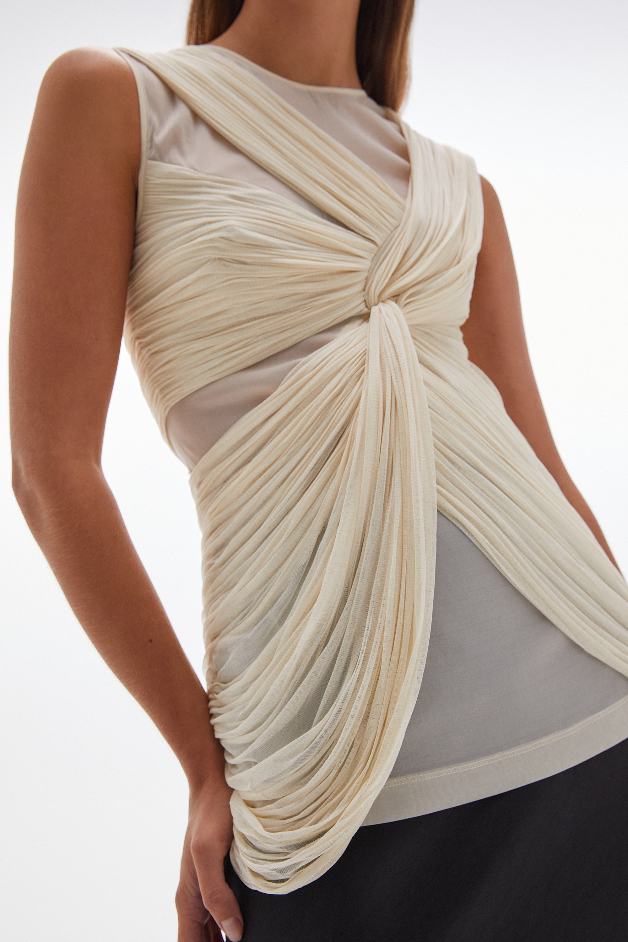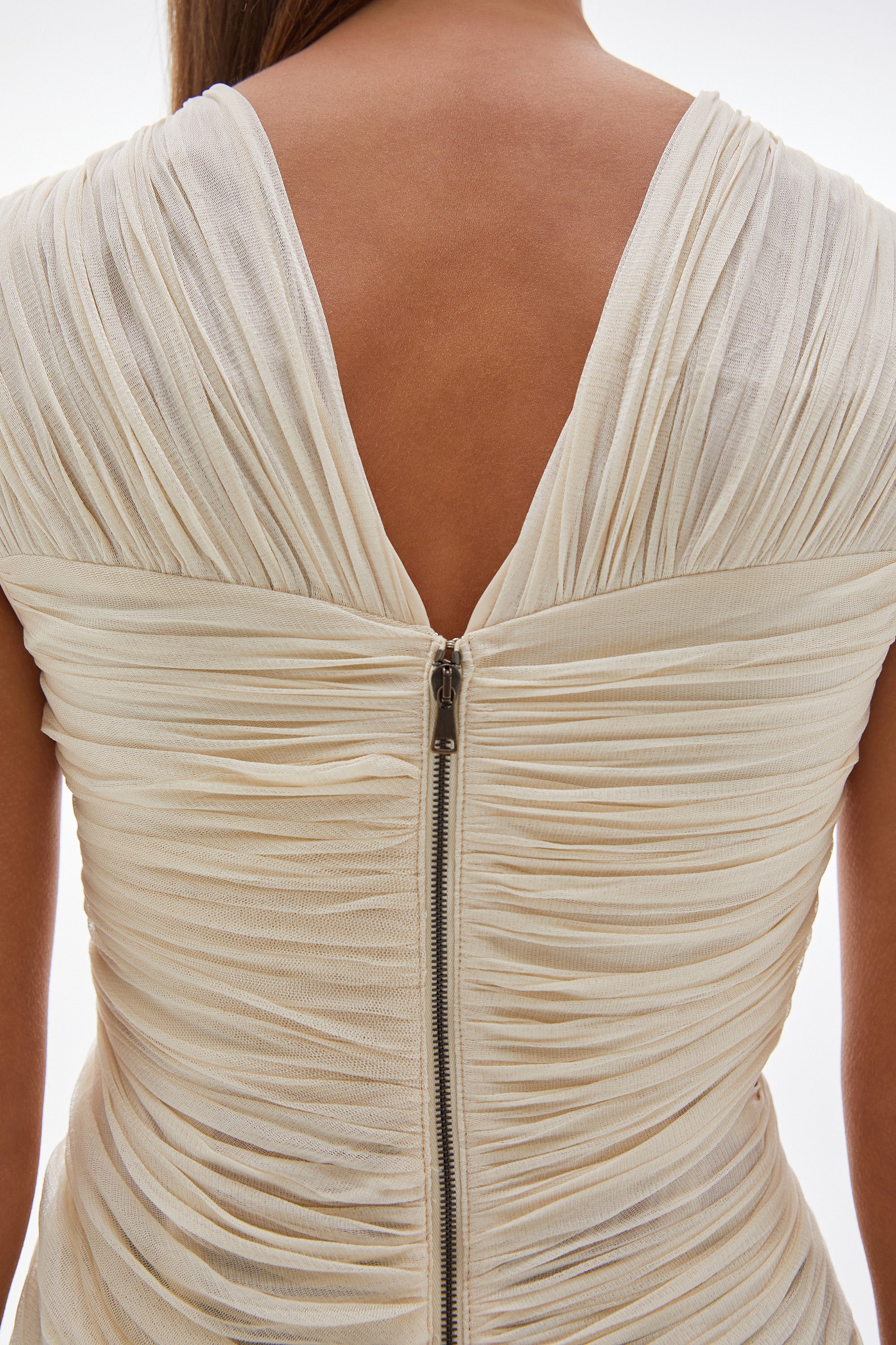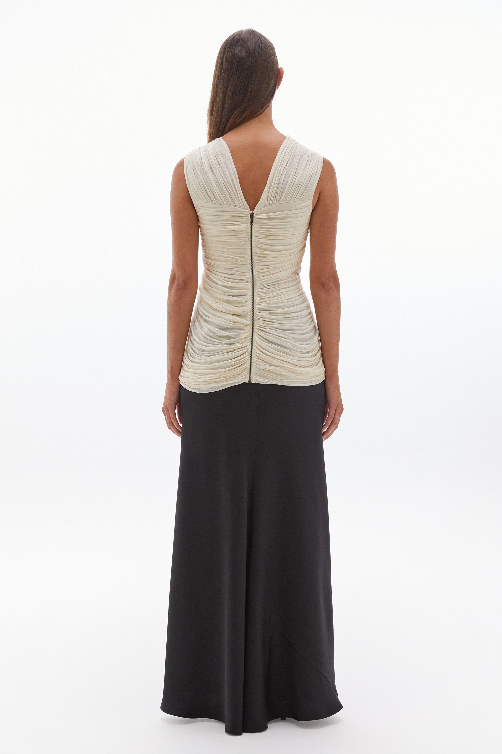 Gather detail top in sheer stretch organza overlaid with hand-draped and twisted silk tulle panels. The bodice is finished with an elegant V-neckline at the back and an exposed metal zipper detail.