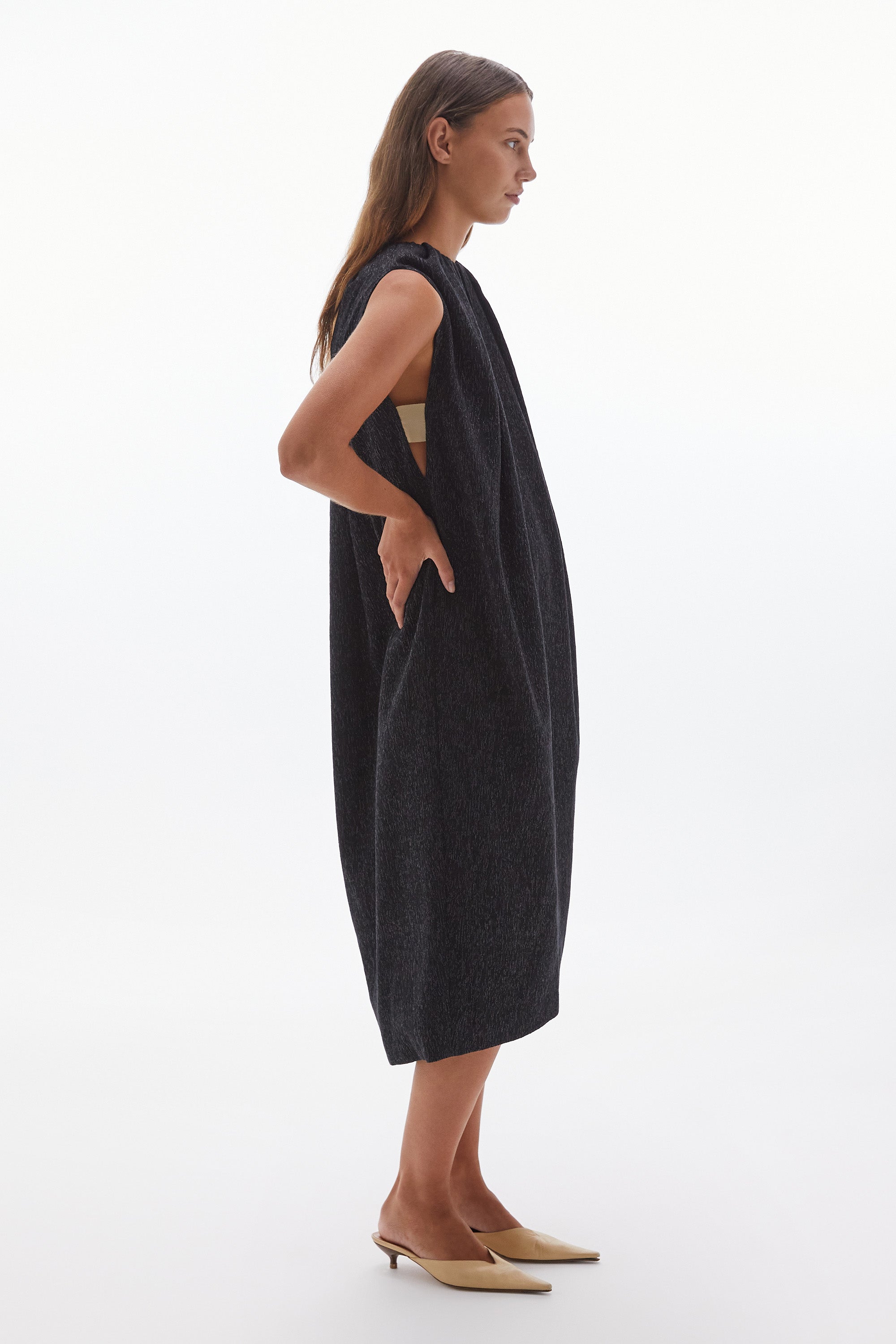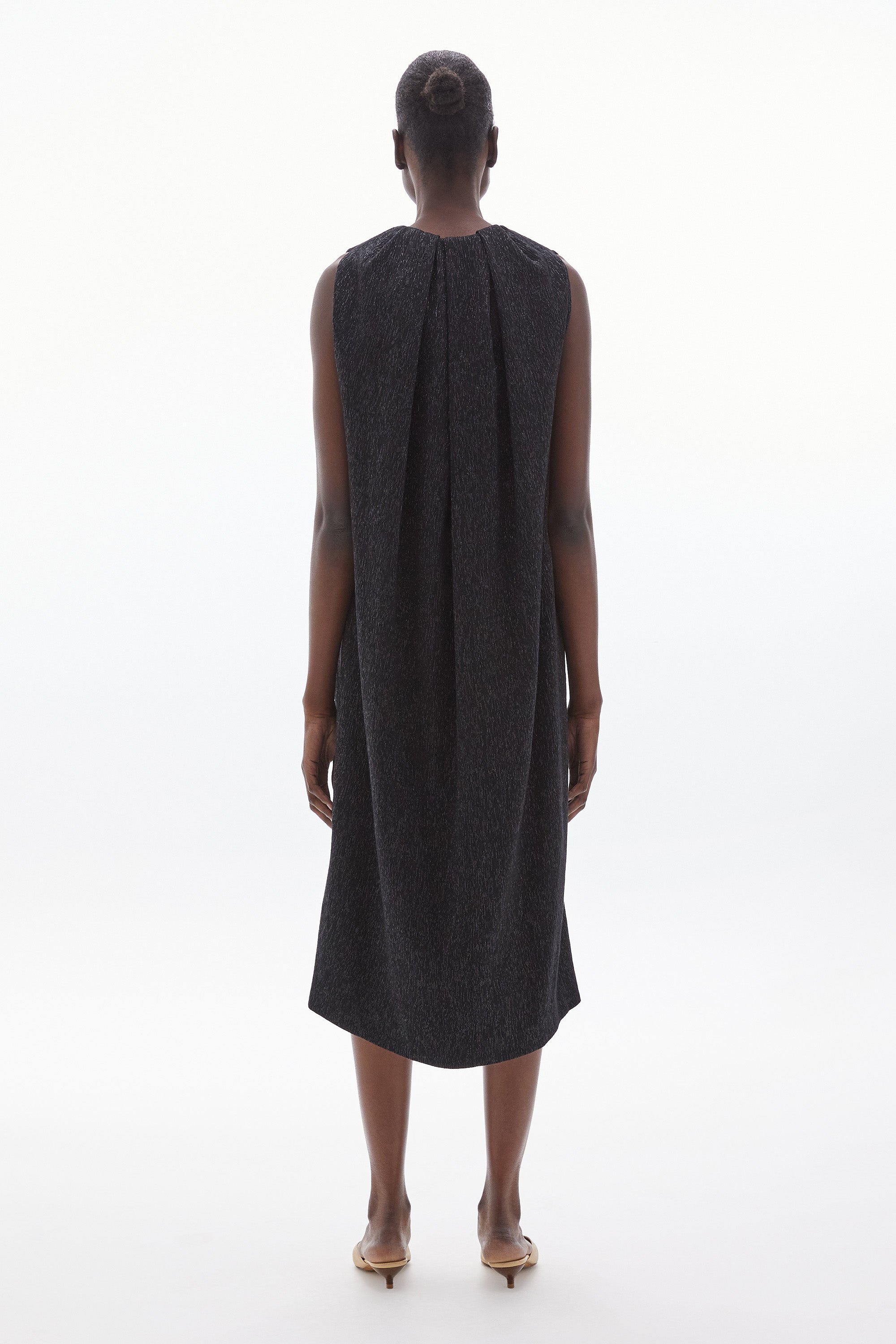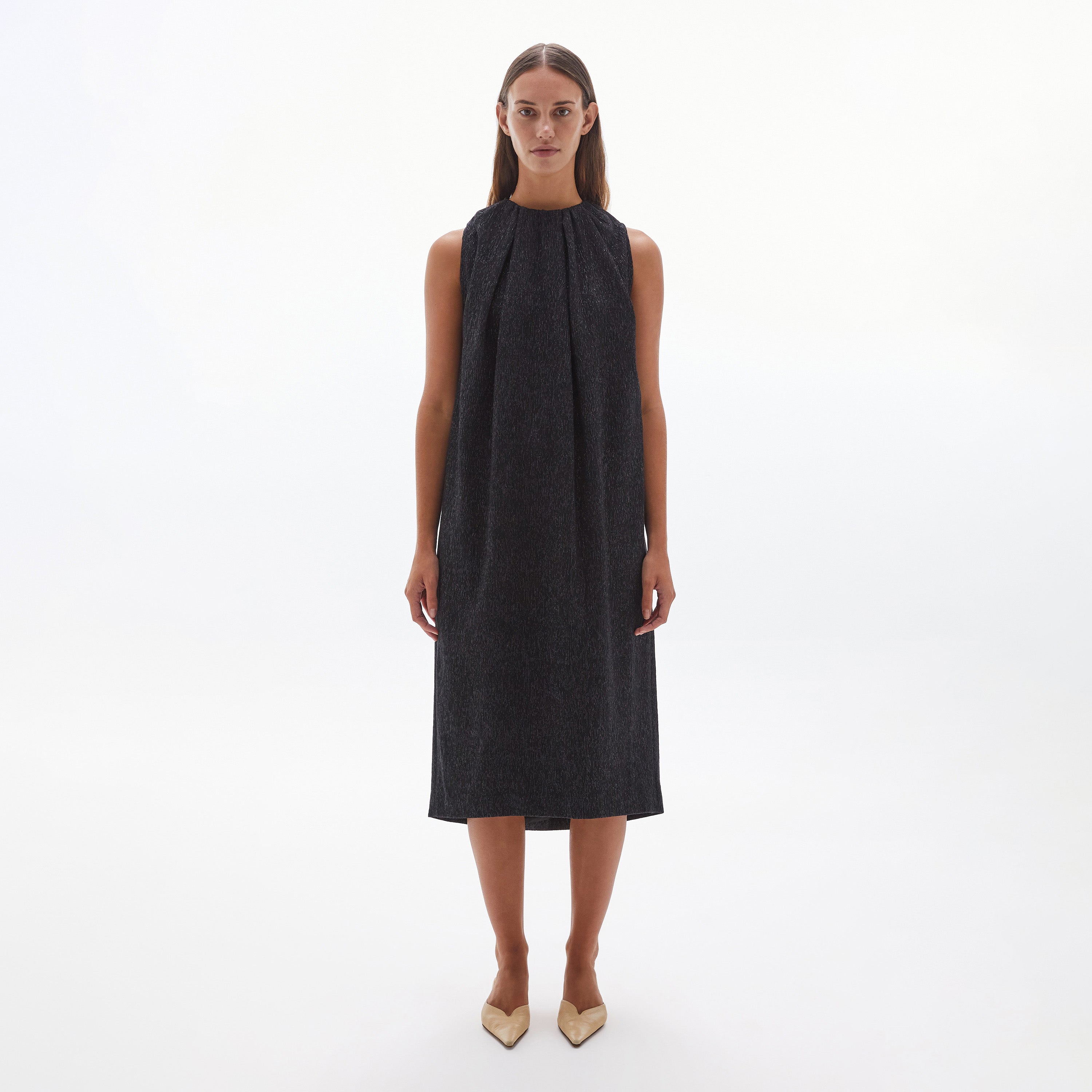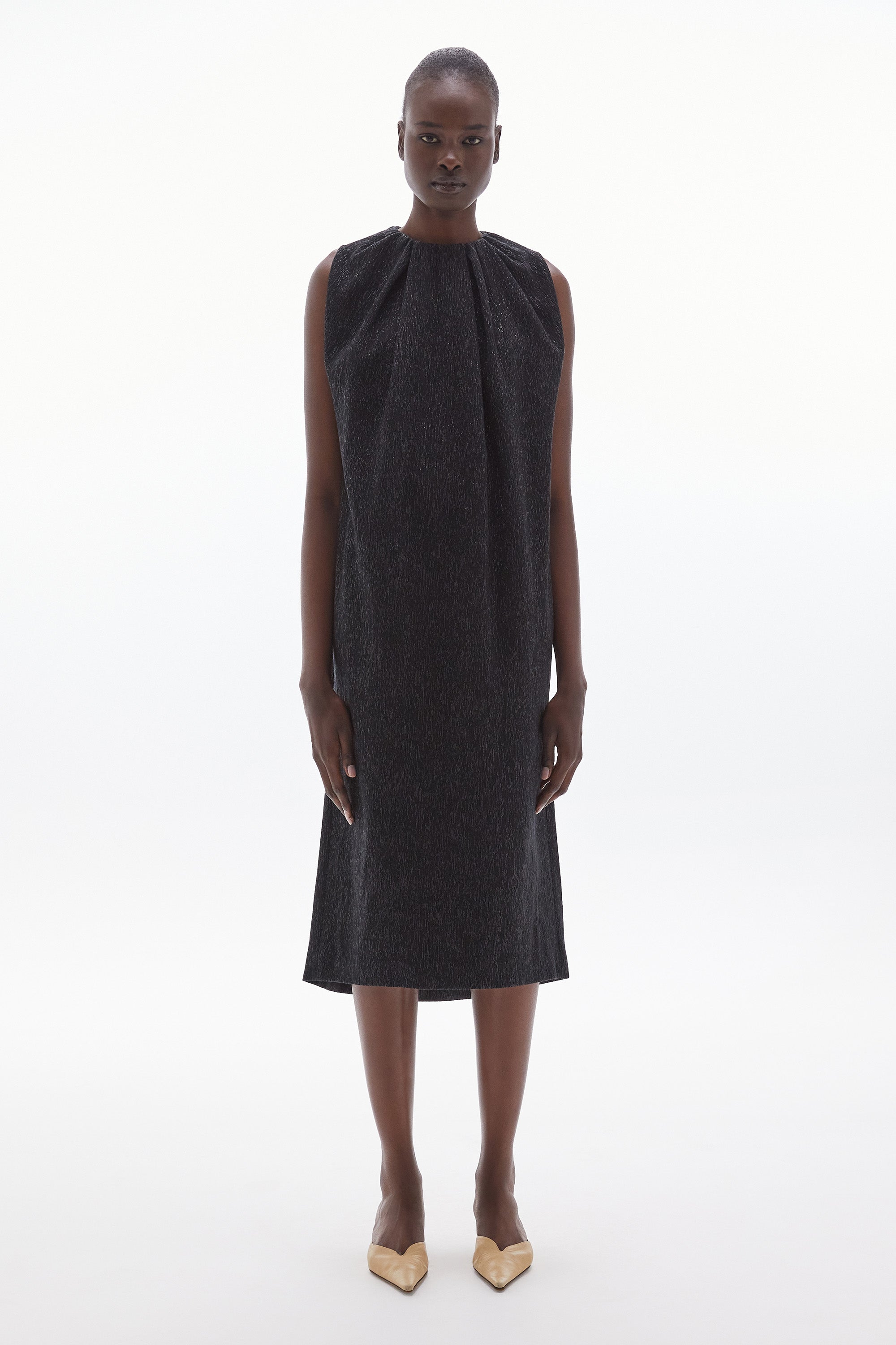 Sleeveless dress in textured lamé cut to a tulip silhouette with an elasticated tuck detail neckline and grosgrain inserts.
