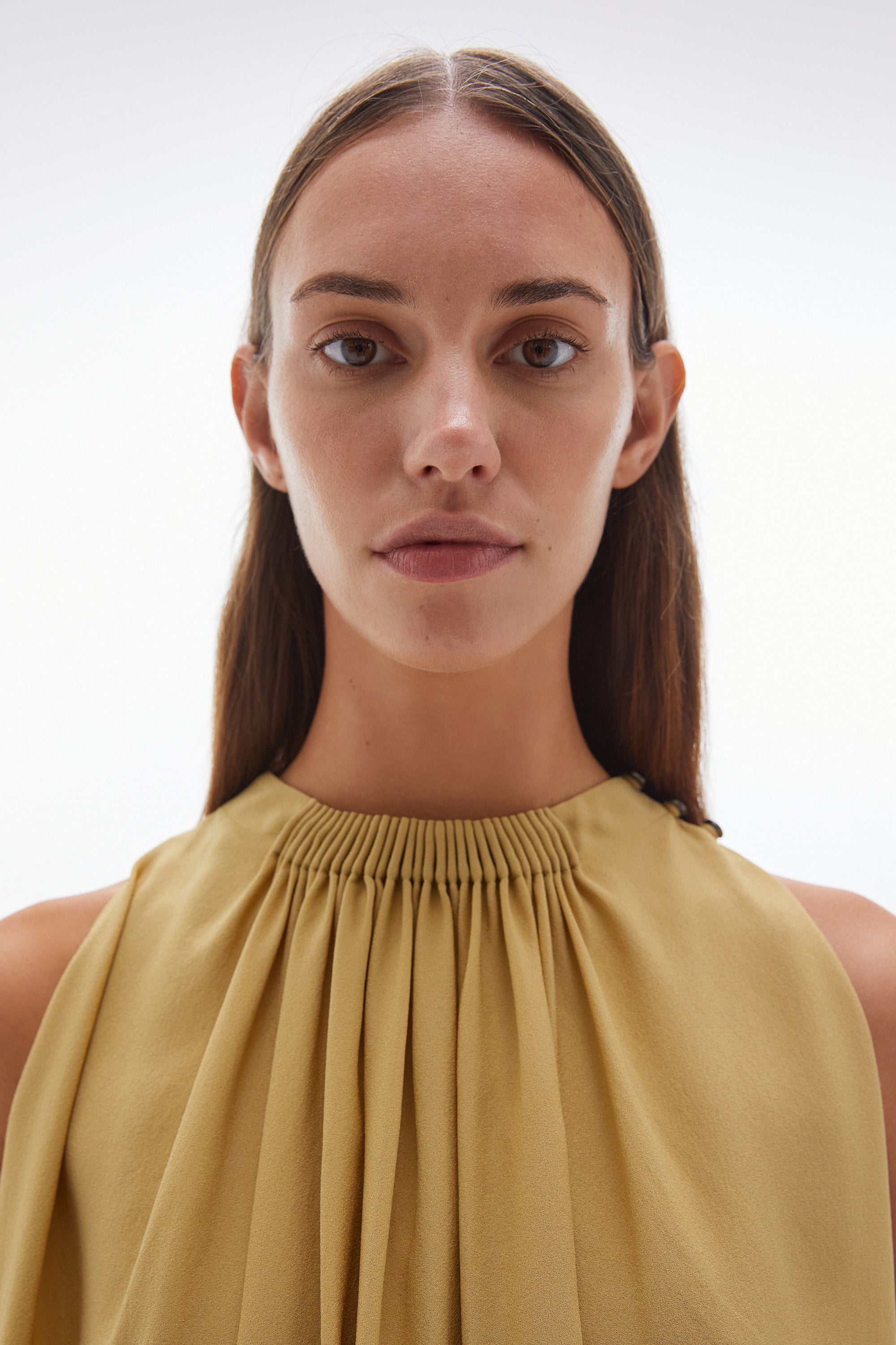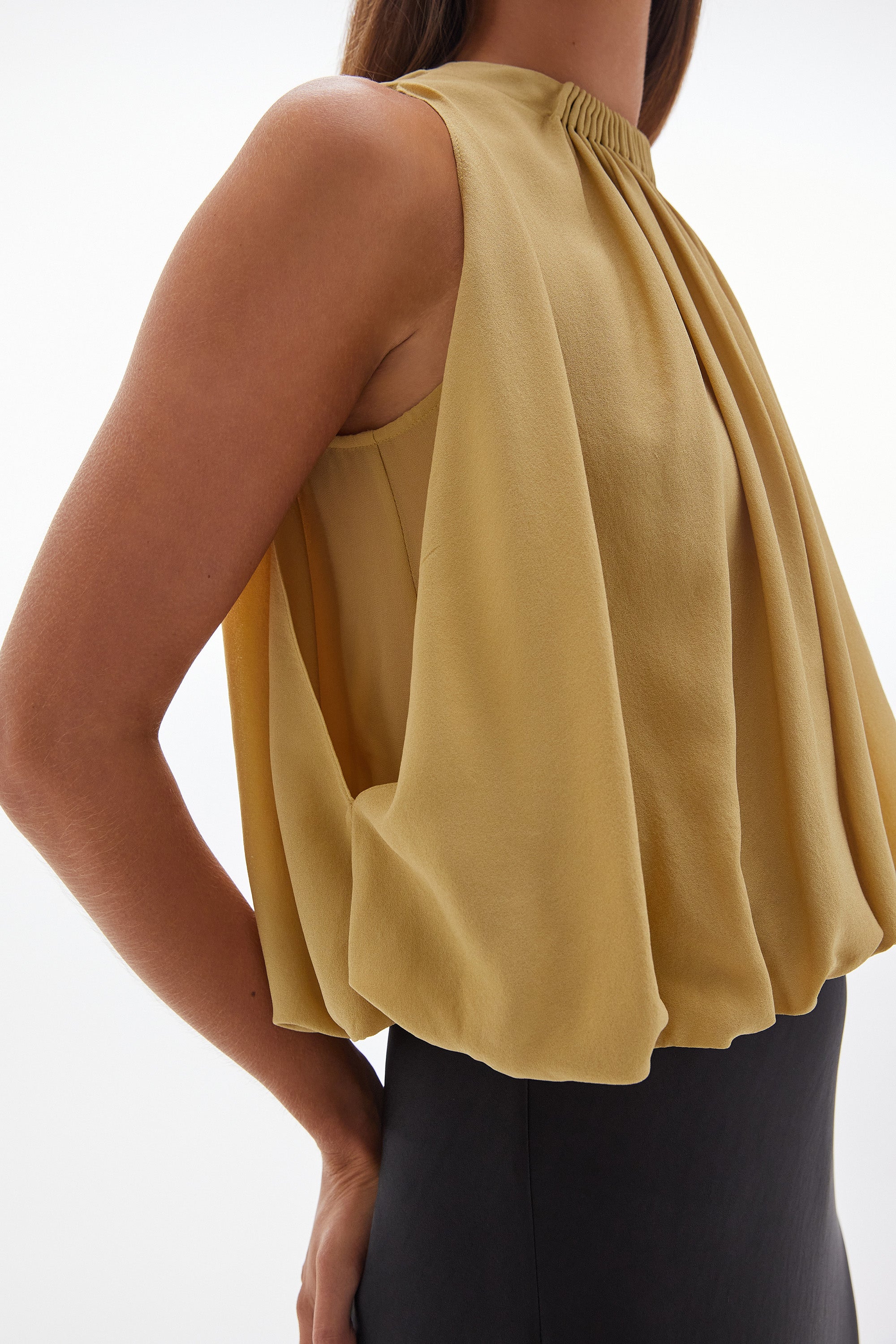 Softly draped sleeveless top in silk crepe with a gathered elasticated hem creating gentle volume. The hand-tucked neckline is finished with a metal button and rouleau loop closure along the side.