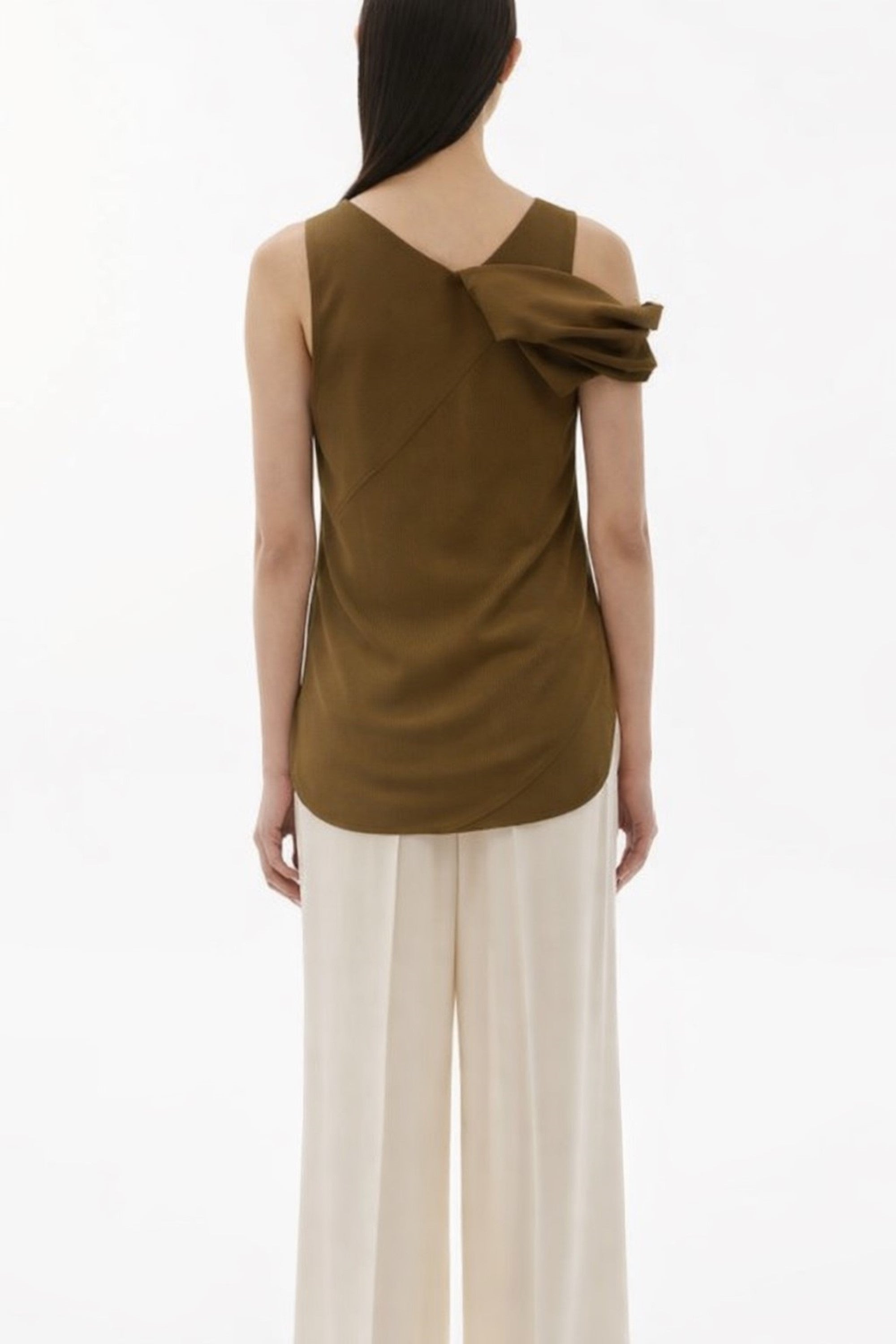 A statement sleeveless top with an elegant off-shoulder drape and modern asymmetric neckline. Cut to skim the body, it features subtle panel detailing and a softly curved hem for a flattering finish. Wear it with tailored trousers or a sleek skirt for effortless occasion dressing.